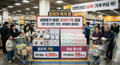 고물가 장기화로 가격 민감도가 극도로 높아진 소비자들을 잡기 위해 대형마트와 편의점 업계가 5천 원 미만 가전, 90원대 생리대 등 초저가 PB 경쟁에 본격적으로 뛰어들었습니다. 유통사들은 이커머스의 공세에 맞서 오프라인 매장으로 고객을 유인하기 위한 강력한 집객 전략을 펼치고 있습니다. 이러한 흐름은 단순한 할인을 넘어 유통업계의 장기적인 생존 전략으로 자리 잡았으며, 소비자들에게는 브랜드보다 실속을 챙길 수 있는 합리적인 선택지가 확대됨과 동시에 실질적인 가계 부담을 낮추는 기회가 되고 있습니다. |